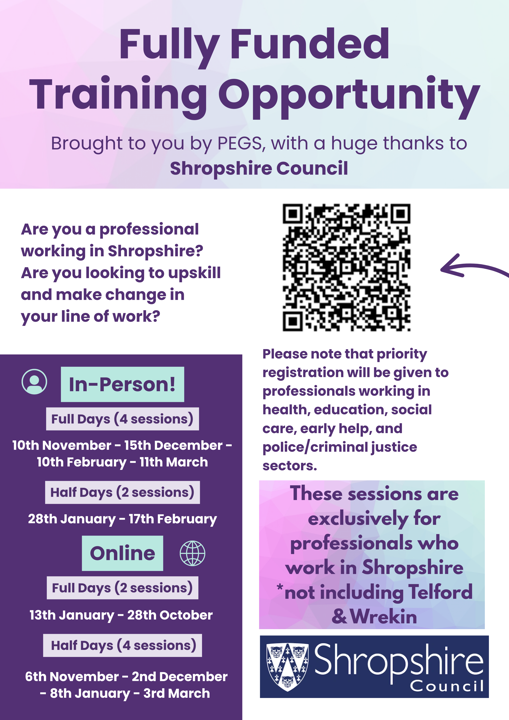 PEGS are offering fully funded Child to Parent Abuse Training Sessions for Shropshire professions. Please see the flyer for dates and booking details.